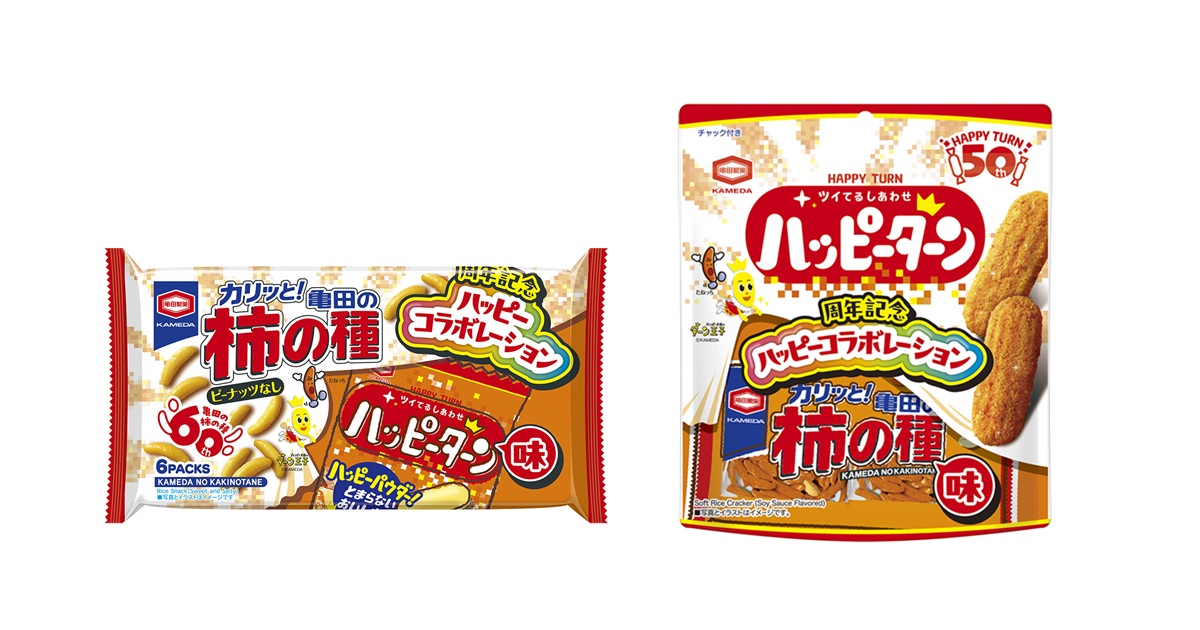 ハッピーターン50周年×亀田の柿の種60周年を記念に、 なんと「ハッピーターン味の柿の種」と「柿の種味のハッピーターン」という、中身が入れ替わったかのようなコラボ商品が登場。