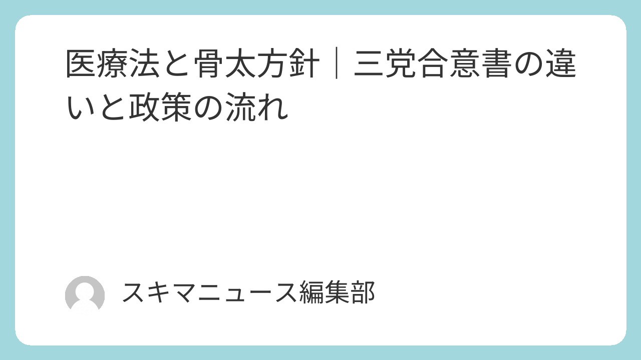 しかし、「医療法に関する三党合意書」と「骨太方針に関する三党合意書」は、一見似ているものの、その目的や性質には大きな違いがあります。本記事では、この2つの合意書の違いと関係性を整理し、今後の政策の流れを解説します。