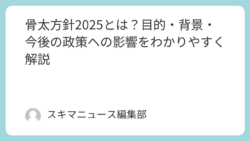 政治経済 骨太方針2025とは?目的・背景・今後の政策への影響をわかりやすく解説 「骨太方針」とは何か「骨太方針(経済財政運営と改革の基本方針)」とは、政府が毎年夏に閣議決定する国の最重要方針のことです。この方針は、翌年度の予算編成や中長期の経済・社会政策の方向性を示す「国家の羅針盤」ともいえる文書で、教育・医療・防衛・... 2025.10.21 政治経済