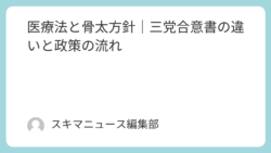 政治経済 医療法に関する三党合意書とは?背景・目的・今後の医療体制への影響を解説 維新と連立を組むことで誕生した高市新総理。連立合意書の中に、「医療法に関する三党合意書」というものがありました。これは、自民、公明、維新の3党によってまとめられた医療制度の根幹部の改正内容が定められたものです。今回はそんな「医療法に関する三... 2025.10.21 政治経済