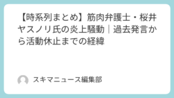 社会 【時系列まとめ】筋肉弁護士・桜井ヤスノリ氏の炎上騒動|過去発言から活動休止までの経緯 「筋肉弁護士」として知られる桜井ヤスノリ氏が、2025年10月、SNS上で大規模な炎上に見舞われています。彼は筋肉質の体型を活かしたユニークなキャラクターと、歯に衣着せぬ発言で人気を集めてきた弁護士。YouTubeチャンネル「筋肉弁護士桜井... 2025.10.23 社会
