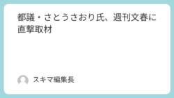 今日のニュース 都議・さとうさおり氏、週刊文春に直撃取材 「非人道的な取材手法」として強く反発東京都議会議員のさとうさおり氏が、自身のYouTubeチャンネルで「週刊文春に直撃取材を受けた」と報告し、その取材手法に対して強く抗議した。動画は10月上旬に公開され、SNS上でも注目を集めている。路上で... 2025.10.12 今日のニュース