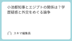 政治経済 小池都知事とエジプトの関係は?学歴疑惑と外交をめぐる論争 東京都の小池百合子知事は、カイロ大学アラビア文学科を「首席で卒業した」と公称しています。しかし、2024年の都知事選を機に浮上した学歴詐称疑惑はいまも尾を引き、さらに2025年8月に東京都がエジプト経済団体(EJBC)と締結した「労働者雇用... 2025.10.01 政治経済