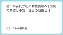 政治経済 高市早苗氏が初の女性首相へ | 国民の希望と不安、注目の政策とは 『日本初の女性首相、高市早苗氏が誕生へ』2025年10月4日、自民党総裁選で高市早苗氏(64)が新総裁に選出され、10月中旬に開かれる臨時国会で日本初の女性総理大臣が誕生する見通しとなった。この歴史的な瞬間に、X(旧Twitter)をはじめ... 2025.10.07 政治経済