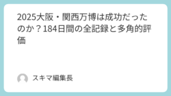 社会 2025大阪・関西万博は成功だったのか?184日間の全記録と多角的評価 2025年10月13日、184日間にわたる「2025年日本国際博覧会(大阪・関西万博)」が幕を閉じた。「いのち輝く未来社会のデザイン」をテーマに掲げ、大阪・夢洲で開催されたこの国際的イベントは、果たして成功だったのだろうか。本記事では、来場... 2025.10.18 社会