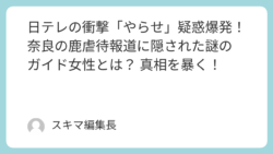未分類 日テレの衝撃「やらせ」疑惑爆発! 奈良の鹿虐待報道に隠された謎のガイド女性とは? 真相を暴く! こんにちは、スキマニュースです!日本テレビ(日テレ)がまたしても「やらせ」疑惑で大炎上中! 今回は奈良公園の鹿虐待問題を扱った『news every.』の報道が、ネットを震撼させています。橙色のポロシャツを着た謎のガイド女性が「暴力は見たこ... 2025.10.01 未分類