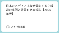 未分類 日本のメディアはなぜ偏向する?報道の実例と背景を徹底解説【2025年版】 民主主義社会において、メディアは「第四の権力」と呼ばれ、行政・立法・司法を監視する重要な役割を担っています。しかし近年、日本のメディアに対して「偏向報道ではないか」という声が高まっています。日テレの生放送インタビューで「支持率を下げてやる発... 2025.10.10 未分類