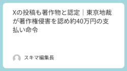 未分類 Xの投稿も著作物と認定|東京地裁が著作権侵害を認め約40万円の支払い命令 SNS時代に問われる「転載の線引き」とは?2025年10月9日、東京地方裁判所で下されたある判決が、SNS利用者の間で大きな注目を集めています。それは──「X(旧Twitter)の投稿は著作物であり、無断転載は著作権侵害に当たる」という判断... 2025.10.10 未分類