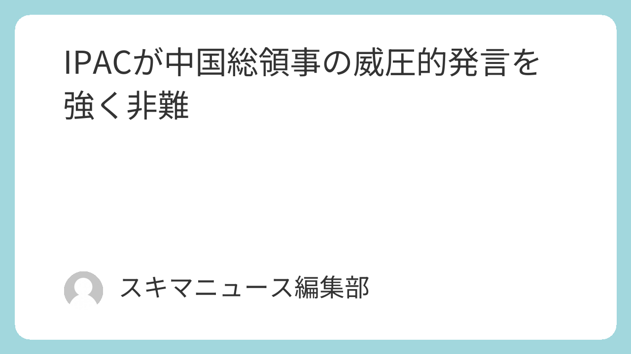 日米欧などの民主主義国家の議員で構成される「対中政策に関する列国議会連盟(IPAC)」は20日、日本の高市早苗首相が台湾有事を「存立危機事態」に該当し得ると答弁したことに対して、中国の薛剣・駐大阪総領事が不穏当な投稿を行った問題について、「威圧的発言を強く非難する」との声明を発表しました。