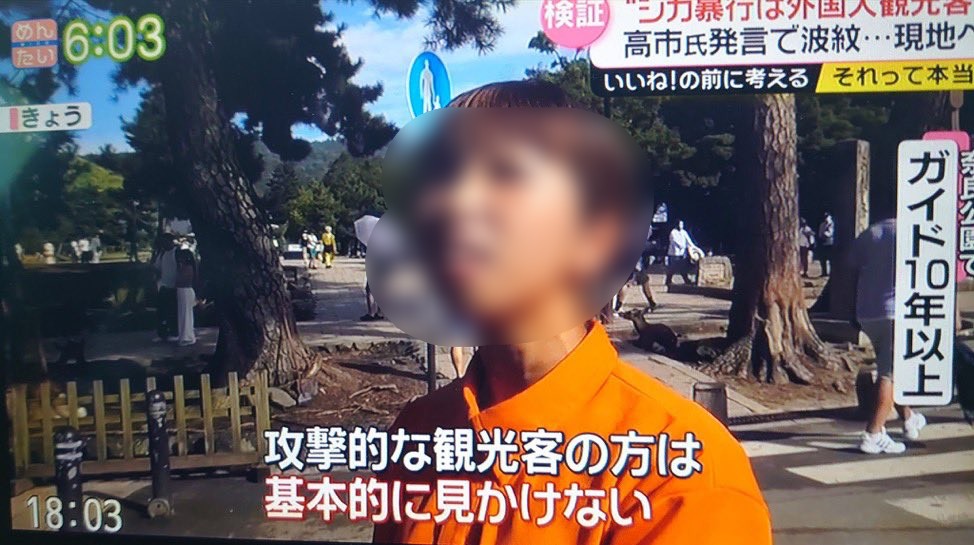 彼女は「ガイド歴10年以上」「鹿の生態に詳しい専門家」とテロップ付きで、「暴力は一度も見たことがない」「外国人の方がフレンドリー」と証言。